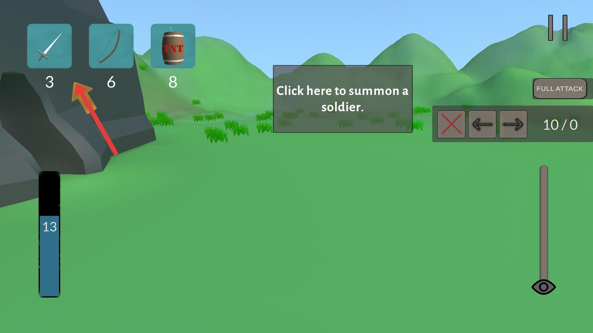 2、戰(zhàn)斗界面有劍、弓、TNT等選項(xiàng),提示點(diǎn)擊召喚士兵,要根據(jù)提示,點(diǎn)擊對(duì)應(yīng)區(qū)域召喚士兵,讓士兵參與戰(zhàn)斗,助力擊敗敵方,熟悉召喚操作。