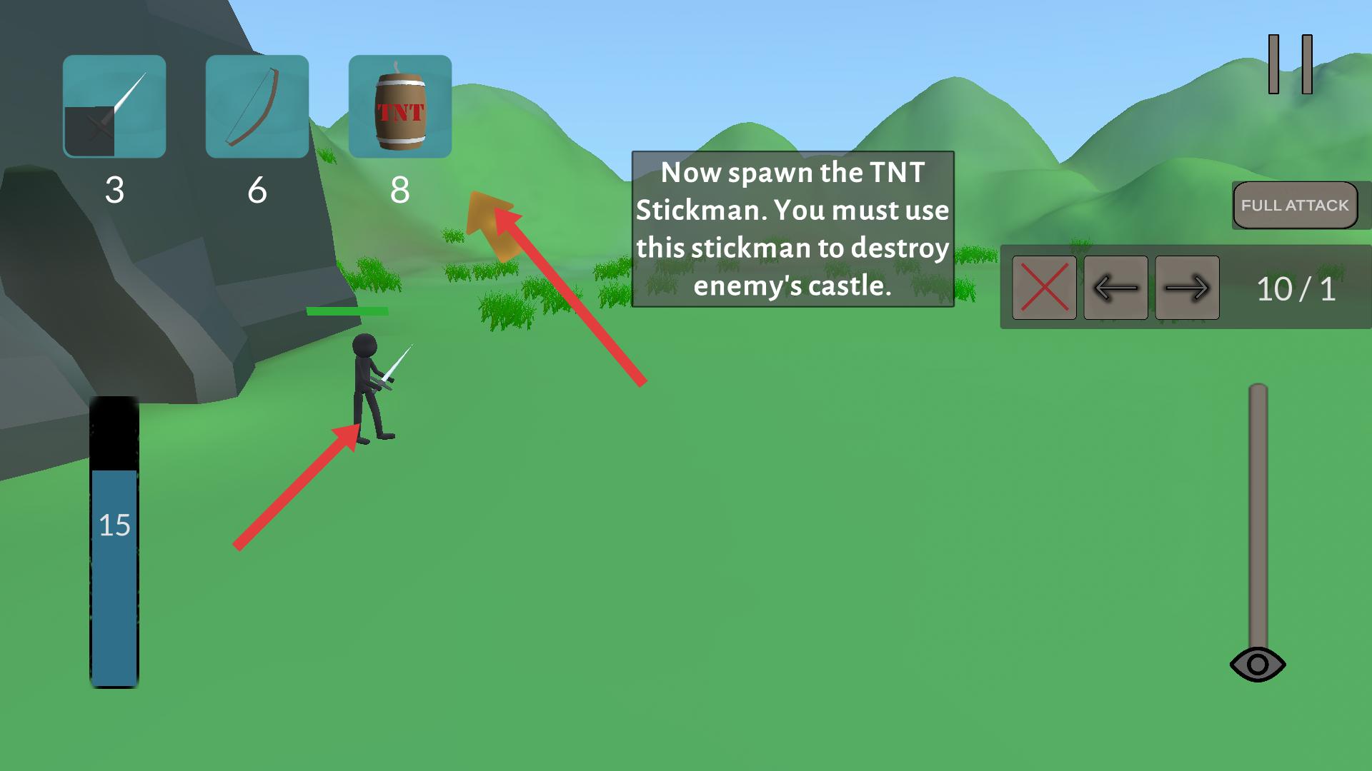 3、提示生成TNT火柴人,用其摧毀敵方城堡,點(diǎn)擊TNT選項(xiàng)生成TNT火柴人,指揮它向敵方城堡移動(dòng),利用其爆炸能力破壞城堡,推進(jìn)戰(zhàn)斗進(jìn)程。
