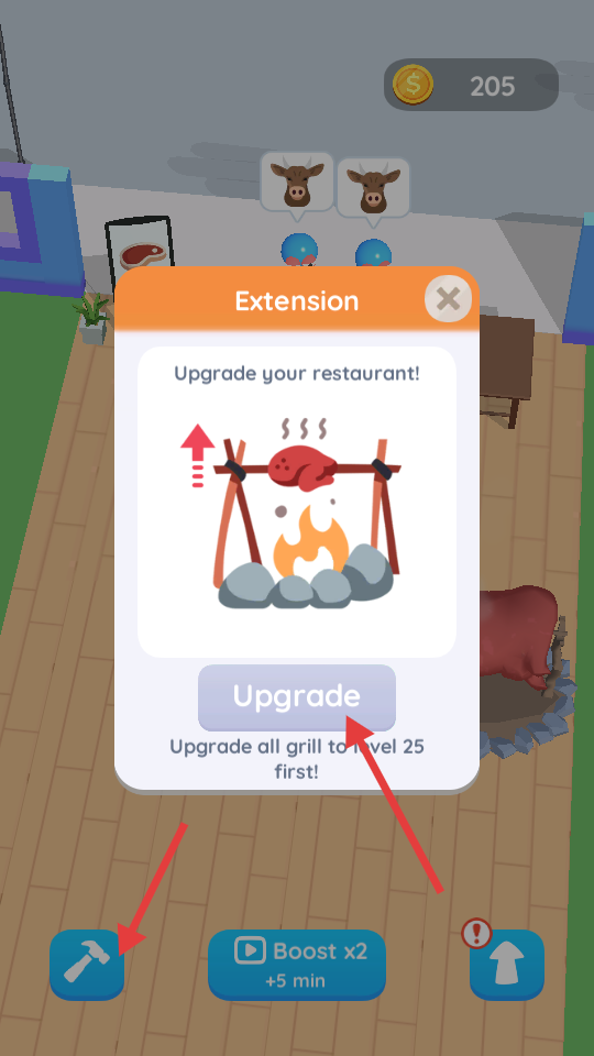 3、當積累一定金幣后,可進行燒烤設施的升級,點擊Upgrade按鈕能升級燒烤架等設施,提升燒烤效率和質(zhì)量,升級后能更好地應對更多顧客和更高難度的訂單。