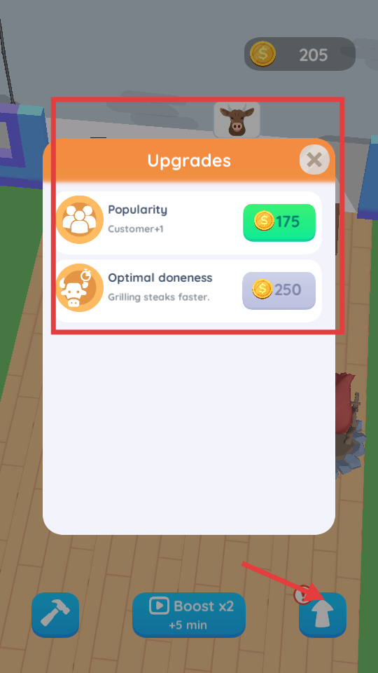 4、除了升級設施還可提升店鋪的其他屬性,在Upgrades界面有Popularity和Optimal doneness等升級選項,消耗相應金幣升級這些屬性能讓店鋪更受歡迎。