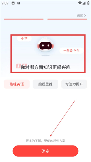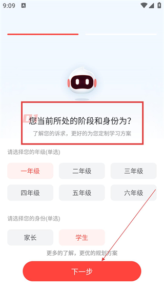 1、進入階段和身份選擇頁面,選擇所在年級,如一年級,再選擇身份為學生,點擊下一步,進入知識興趣選擇頁面。