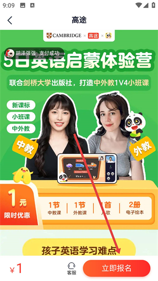 3、在英語啟蒙體驗營報名頁面,查看課程相關(guān)信息,確認后點擊立即報名,進入支付信息確認頁面。