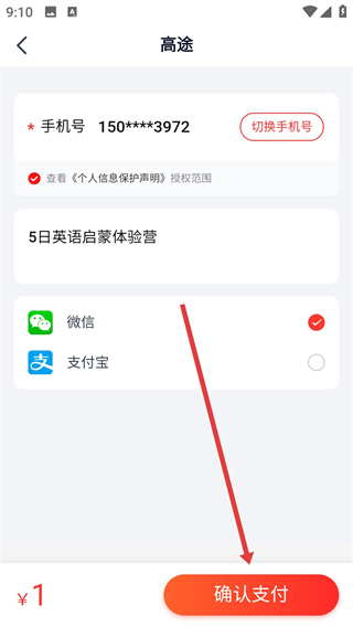4、在支付信息確認頁面,確認手機號、課程及支付方式等信息,選擇微信或支付寶,點擊確認支付,完成報名繳費。