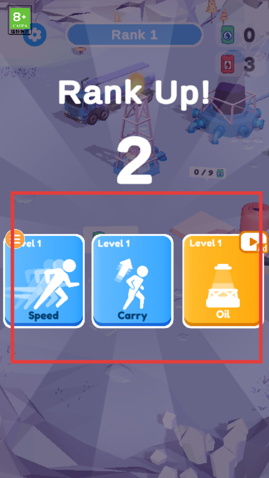 2、當(dāng)達(dá)到一定條件后會(huì)升級(jí),升級(jí)時(shí)會(huì)出現(xiàn)RankUp界面,這里有Speed、Carry、Oil等能力提升選項(xiàng),可根據(jù)需求選擇升級(jí),助力玩家油田發(fā)展。