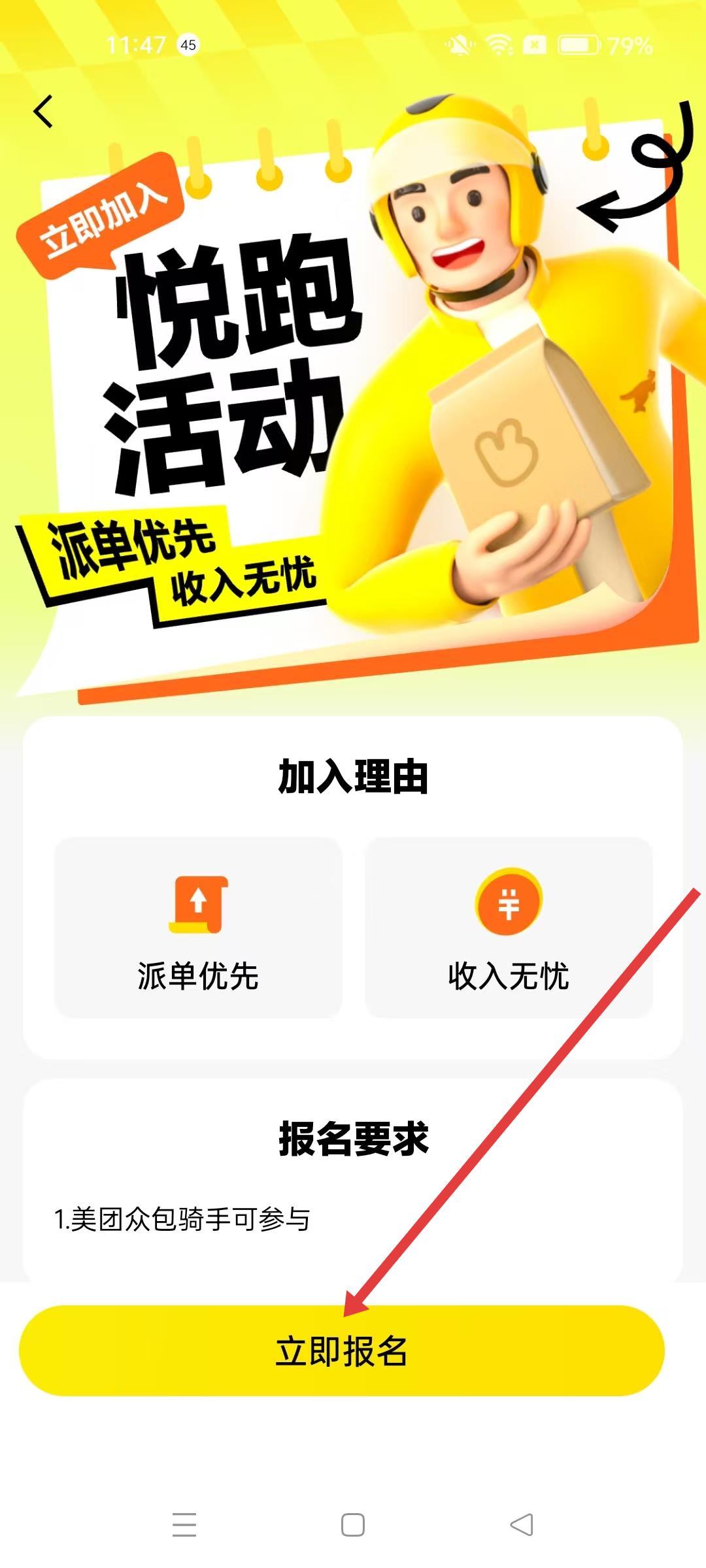 3、悅跑活動(dòng)界面,可查看派單優(yōu)先、收入無(wú)憂的加入理由及報(bào)名要求,點(diǎn)擊立即報(bào)名按鈕進(jìn)入申請(qǐng)?zhí)顚懡缑妗?