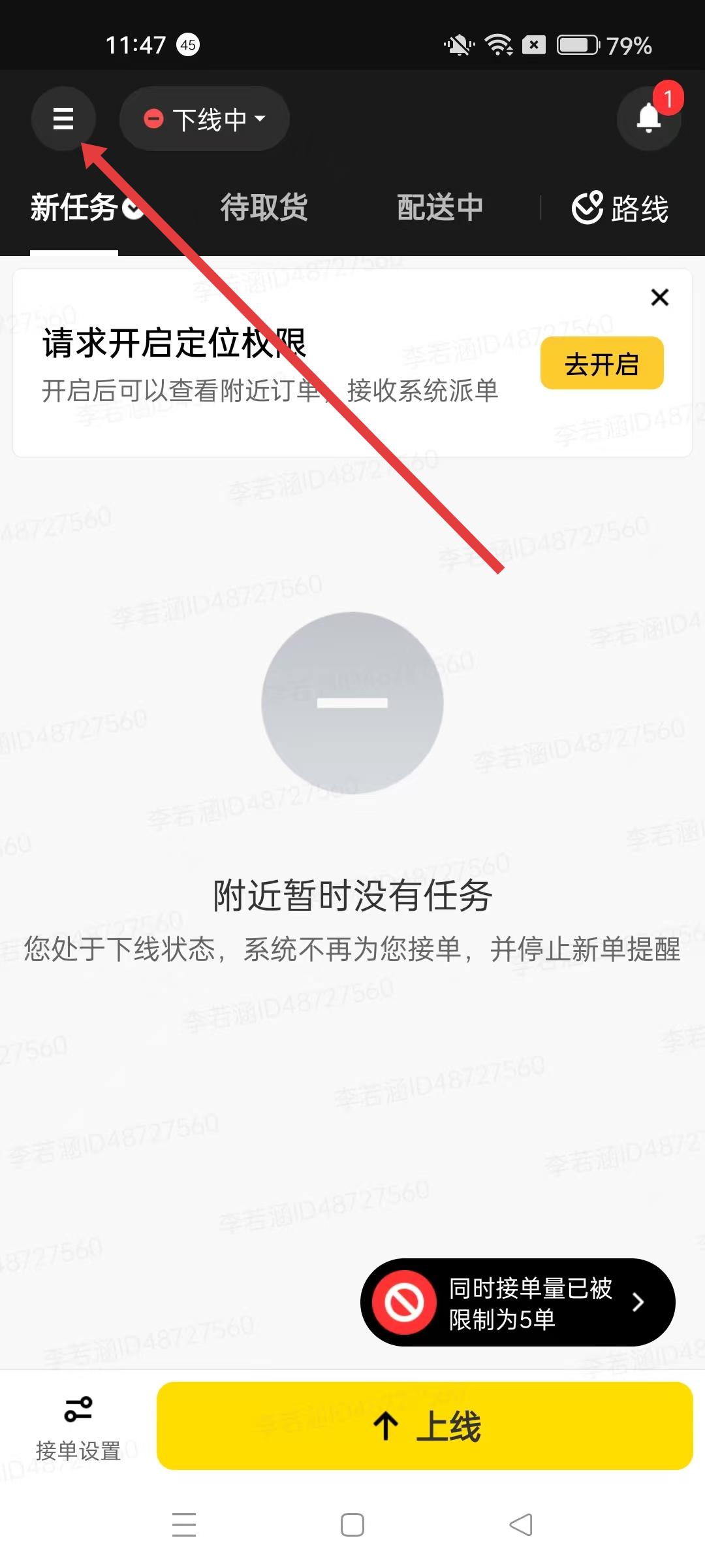 1、進(jìn)入美團(tuán)眾包主界面,點(diǎn)擊左上角三條橫線的菜單按鈕,展開功能列表,準(zhǔn)備進(jìn)行悅跑活動(dòng)報(bào)名操作。