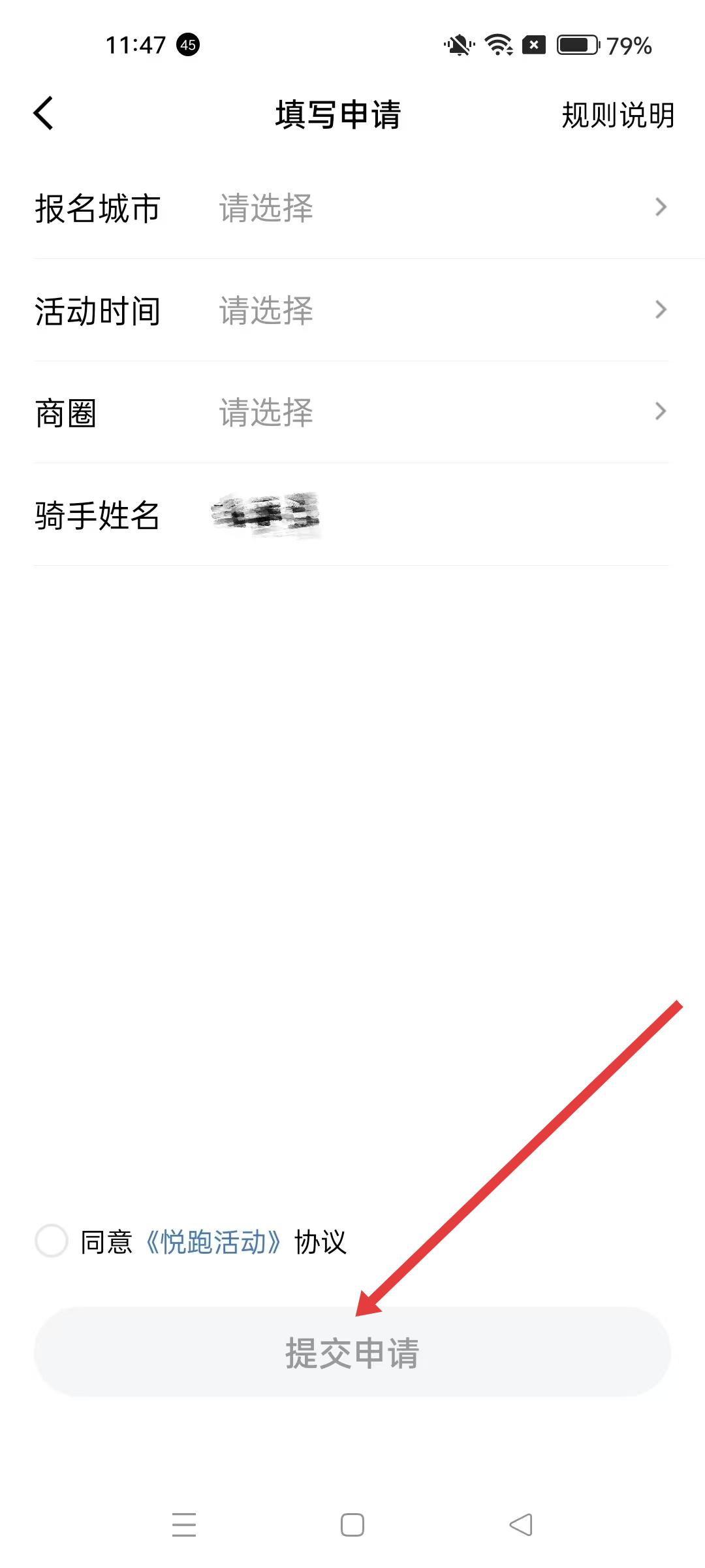 4、填寫申請(qǐng)界面,選擇報(bào)名城市、活動(dòng)時(shí)間、商圈,確認(rèn)騎手姓名并同意協(xié)議后,點(diǎn)擊提交申請(qǐng)完成報(bào)名流程。
