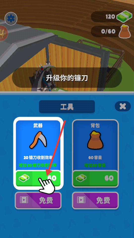 3、為了更高效地賺錢可升級工具,比如升級鐮刀消耗一定資金,能提升鐮刀的收割效率,這樣在相同時間內(nèi)可以收獲更多農(nóng)作物,進(jìn)而能出售更多農(nóng)作物賺取更多金錢。