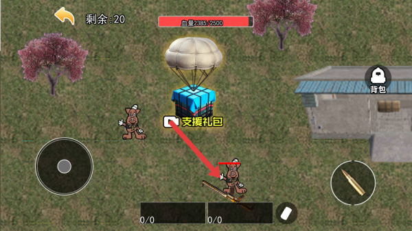 2、游戲會有帶降落傘的支援禮包降落,靠近禮包,可獲取其中的物品,助力生存打敗敵人。