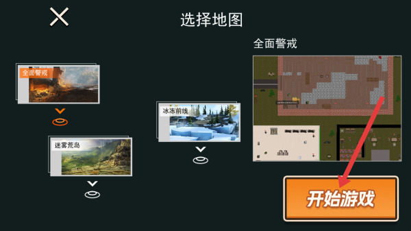 1、進入游戲有全面警戒、冰凍前線、迷霧荒島等地圖可選,選好后點擊開始游戲,開啟生存冒險。