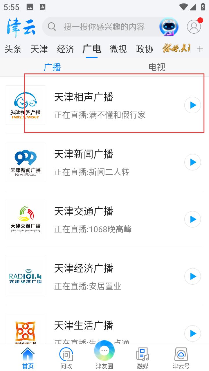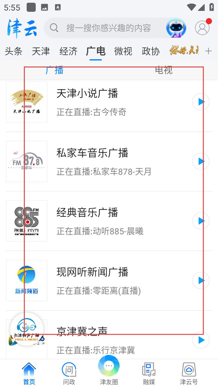 1、打開津云app首頁,點擊廣電標(biāo)簽,即可進(jìn)入廣播電臺選擇界面,這里匯集天津相聲廣播、新聞廣播等多套本地廣播節(jié)目,方便你根據(jù)喜好選擇收聽。