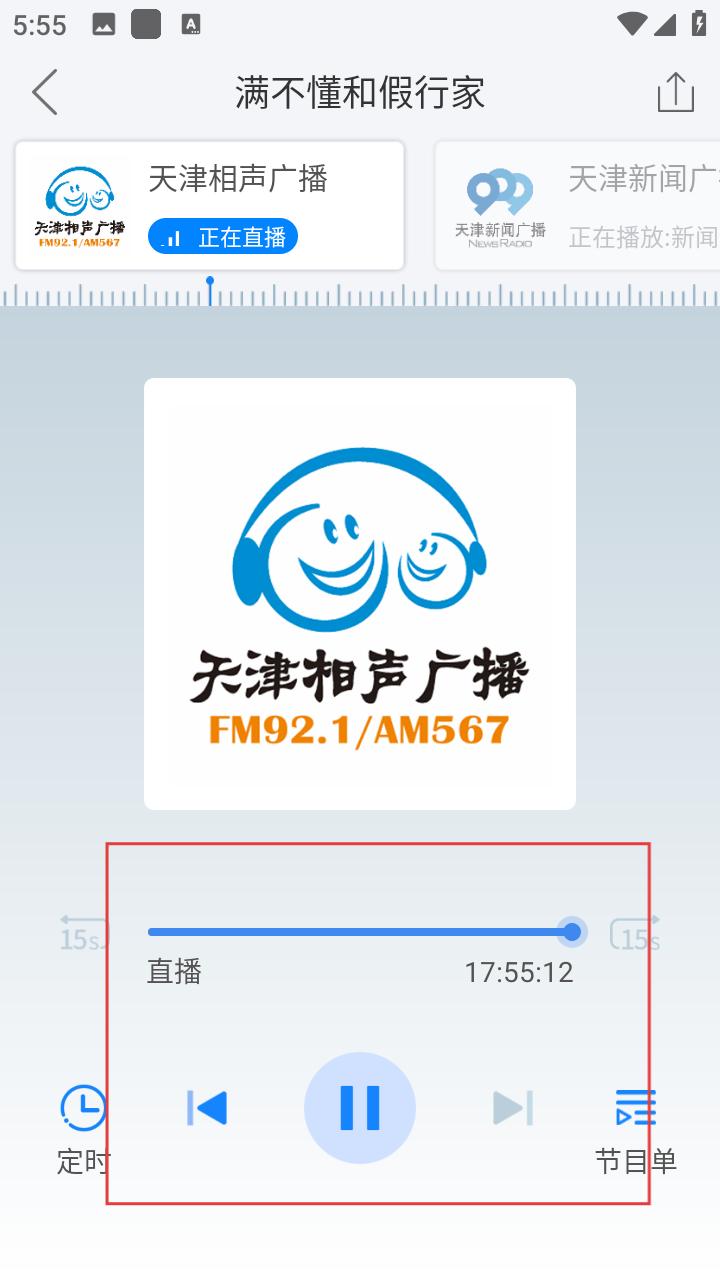 2、在廣播電臺選擇界面,找到天津相聲廣播并點擊右側(cè)播放按鈕,即可進(jìn)入該電臺的直播收聽界面,實時收聽滿不懂和假行家等精彩相聲節(jié)目。