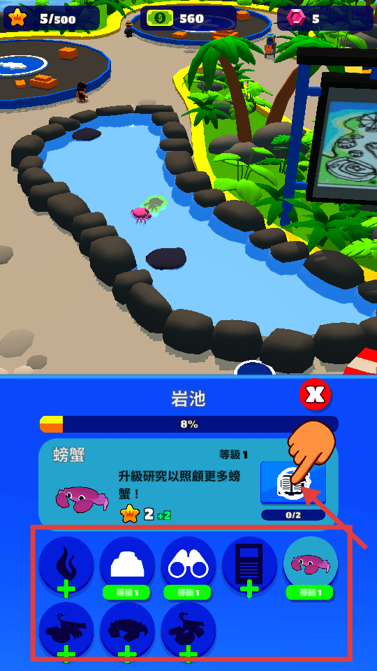 1、首先可通過(guò)相關(guān)界面解鎖和升級(jí)海洋生物,界面會(huì)顯示海洋生物的等級(jí)等信息,還有升級(jí)研究的選項(xiàng),花費(fèi)一定資源升級(jí)研究后,能照顧更多該類海洋生物。