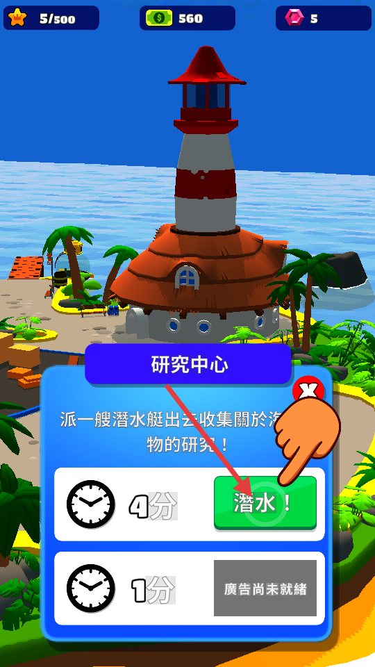 2、游戲中有研究中心,可派遣潛水艇出去收集海洋生物的研究資料,在研究中心界面選擇合適的潛水艇派遣時(shí)長(zhǎng),點(diǎn)擊潛水按鈕潛水艇就會(huì)出發(fā)去探索海洋。