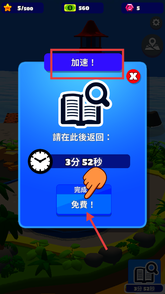 3、當(dāng)潛水艇外出收集資料或進(jìn)行其他研究時(shí),若想加快進(jìn)程可使用加速功能,在加速界面能看到剩余的等待時(shí)間,用寶石可以減少等待時(shí)長(zhǎng),讓研究更快完成。