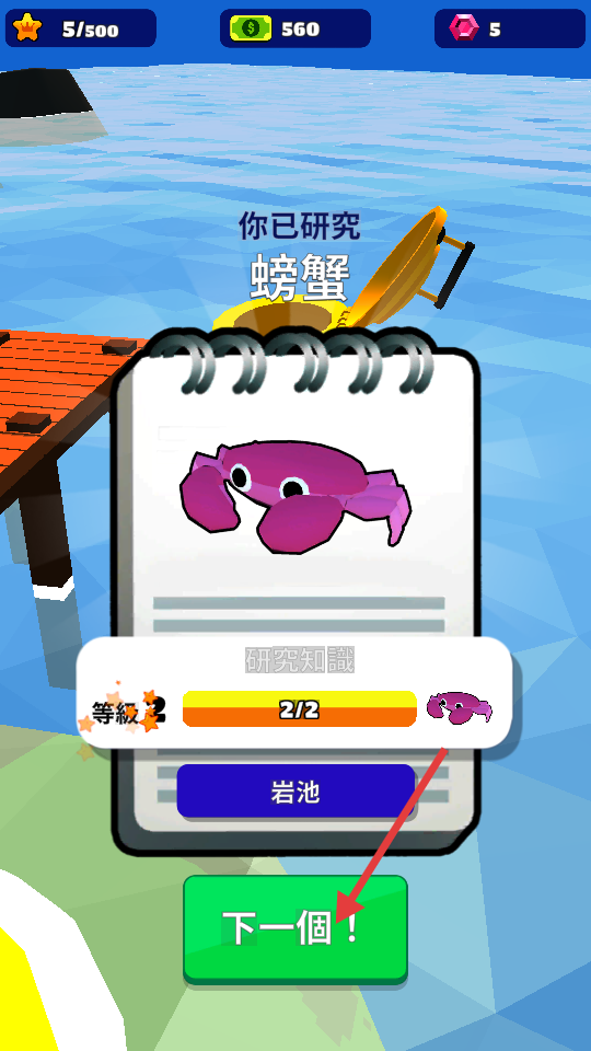 4、完成對(duì)某一海洋生物的研究后,會(huì)彈出研究完成界面,展示該海洋生物的研究成果,包括等級(jí)等信息,此時(shí)點(diǎn)擊下一個(gè)按鈕,可繼續(xù)進(jìn)行下一種海洋生物的研究。