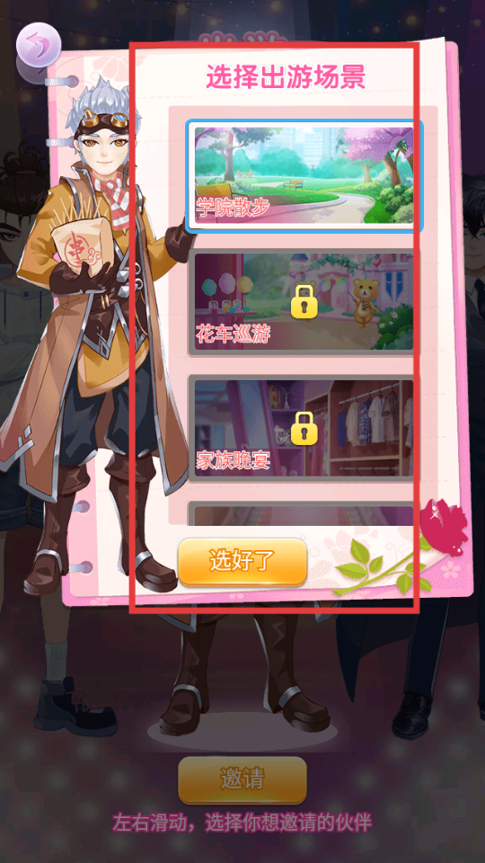 2、角色裝扮好后進入選擇出游場景環(huán)節(jié),界面會展示多個場景選項,選擇已解鎖的場景,然后點擊選好了按鈕即可確定出游場景,準備開啟在該場景下的互動。