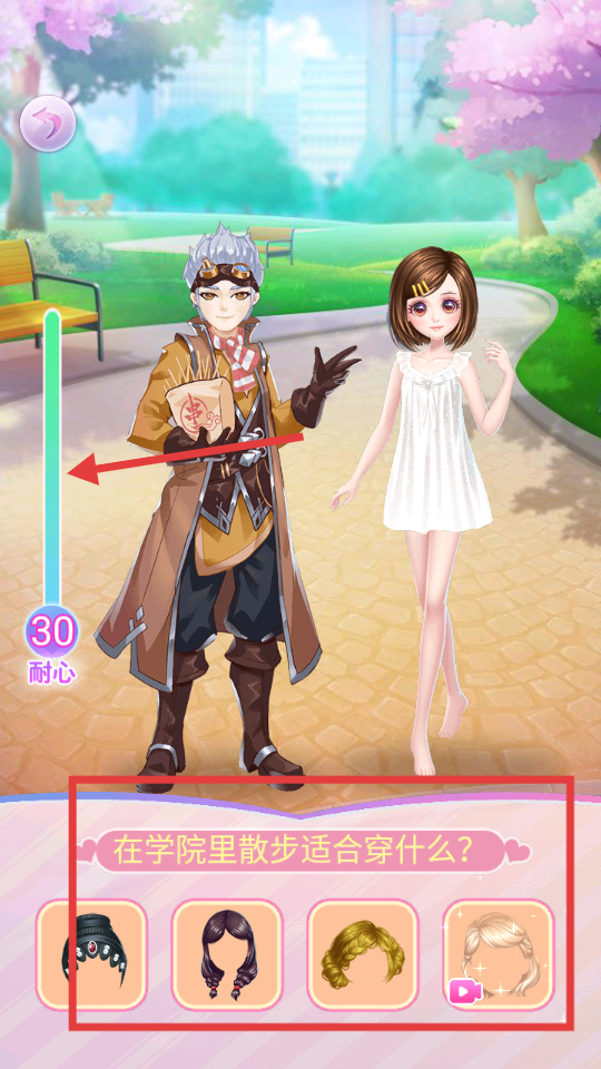 3、進入選定的出游場景后會出現(xiàn)互動問題,同時下方會給出相關的裝扮選項,根據(jù)場景和問題選擇合適的裝扮進行調整,左邊是耐心值提示,增添游戲的互動性與趣味性。