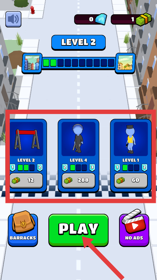 1、游戲界面界面中顯示了不同的防御設(shè)施和兵種,每個都有對應(yīng)的等級,使用綠色的箱子資源可以升級它們,準(zhǔn)備就緒后點擊PLAY按鈕進入戰(zhàn)斗關(guān)卡。