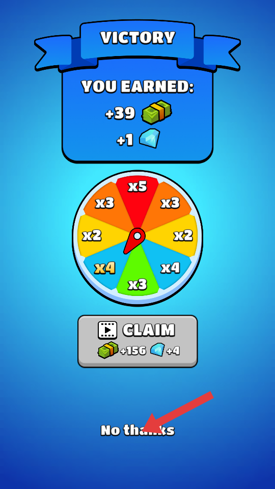 4、成功抵御敵人進攻完成關(guān)卡后,會彈出VICTORY結(jié)算界面,顯示你獲得的箱子資源和藍(lán)色水晶數(shù)量,還能通過轉(zhuǎn)動輪盤獲取多倍獎勵,點擊No thanks則領(lǐng)取基礎(chǔ)獎勵。