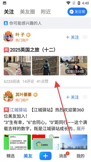 2、在好友動(dòng)態(tài)頁(yè)面瀏覽好友發(fā)布的內(nèi)容,找到感興趣的動(dòng)態(tài),比如2025英國(guó)之旅,點(diǎn)擊該動(dòng)態(tài),進(jìn)入動(dòng)態(tài)詳情頁(yè)面。