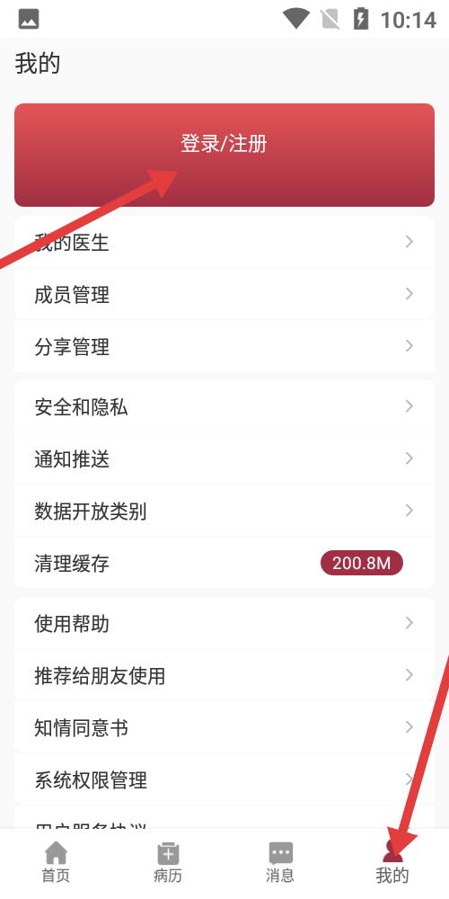 2、我的頁面布局明了頂部紅色登錄注冊按鈕醒目,下方羅列我的醫(yī)生、成員管理等功能,底部導(dǎo)航切換便捷,幫助用戶管理賬號信息,暢享健康服務(wù)。