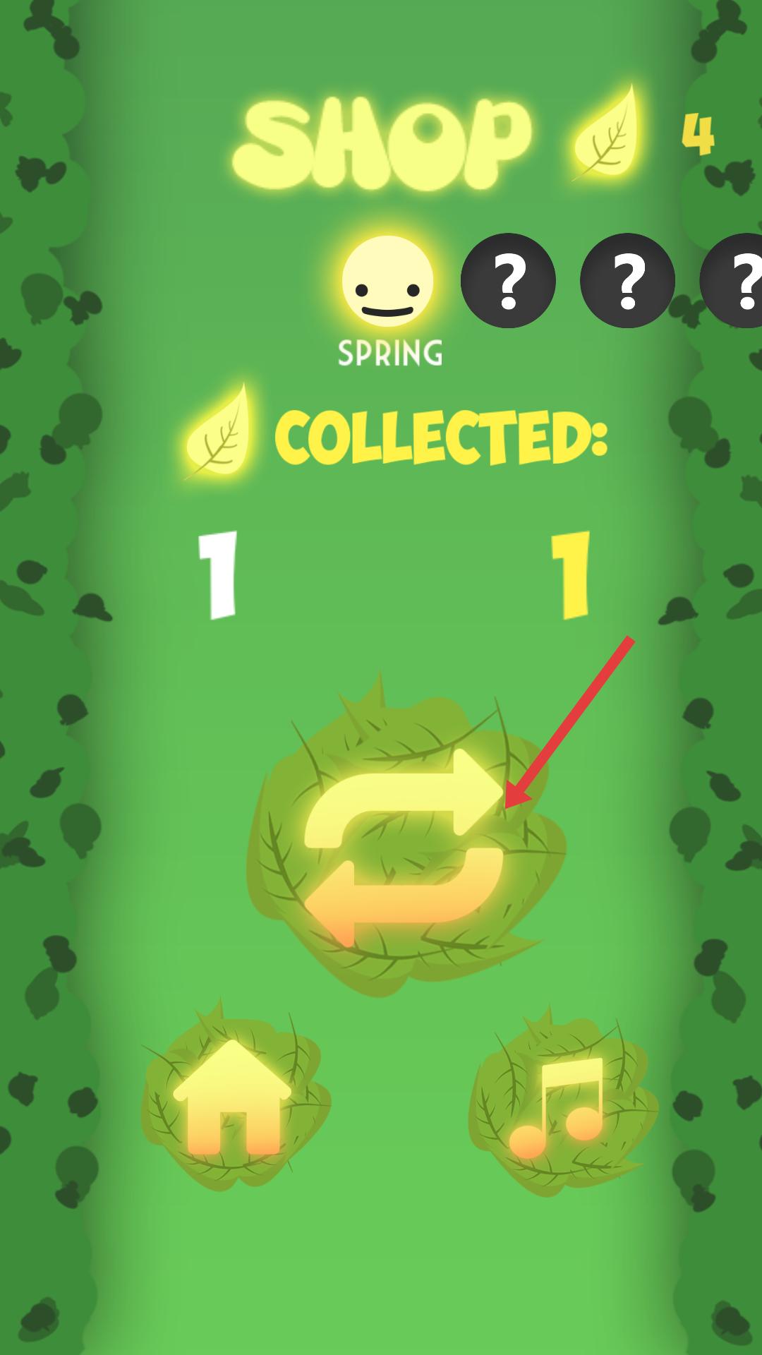4、游戲商店界面顯示收集的葉子數(shù)量,點擊帶有雙向箭頭的按鈕,可刷新或查看更多內(nèi)容,也能回到游戲或調(diào)整音樂等設(shè)置。