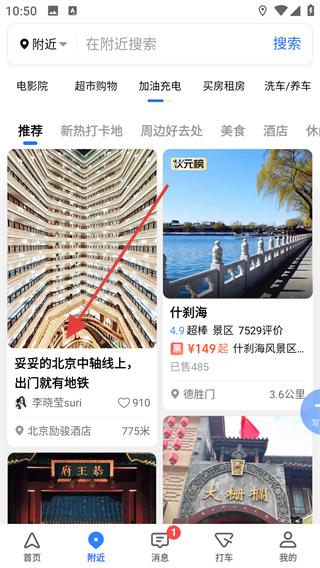 1、打開高德地圖APP,進(jìn)入附近頁面瀏覽推薦的地點,如北京勵駿酒店等,點擊進(jìn)入該地點詳情頁。