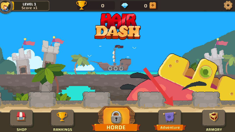 1、玩家下載游戲進入點擊主界面中的Adventure進入冒險模式,在關卡里操控角色前進,按照提示點擊屏幕特定區(qū)域。