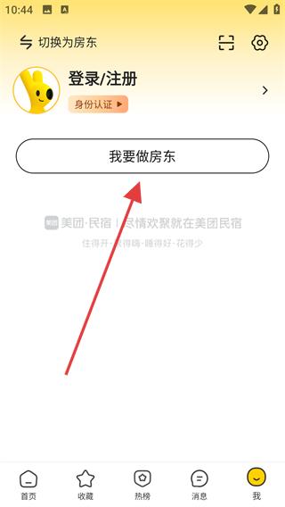 1、打開美團(tuán)民宿APP,進(jìn)入相關(guān)頁面看到我要做房東按鈕,若有成為房東的意向,可點(diǎn)擊該按鈕,進(jìn)入登錄注冊頁面,準(zhǔn)備進(jìn)行身份認(rèn)證等操作。