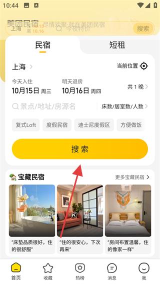 3、登錄后進(jìn)入民宿搜索頁面,選擇入住和退房日期,填寫景點(diǎn)、地址等信息,也可根據(jù)復(fù)式loft、度假民宿等標(biāo)簽篩選,然后點(diǎn)擊搜索。