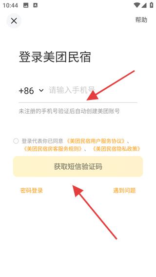 2、在登錄美團(tuán)民宿頁面,輸入手機(jī)號(hào)碼,點(diǎn)擊獲取短信驗(yàn)證碼,通過驗(yàn)證碼完成登錄,未注冊的手機(jī)號(hào)驗(yàn)證后會(huì)自動(dòng)創(chuàng)建美團(tuán)賬號(hào)。