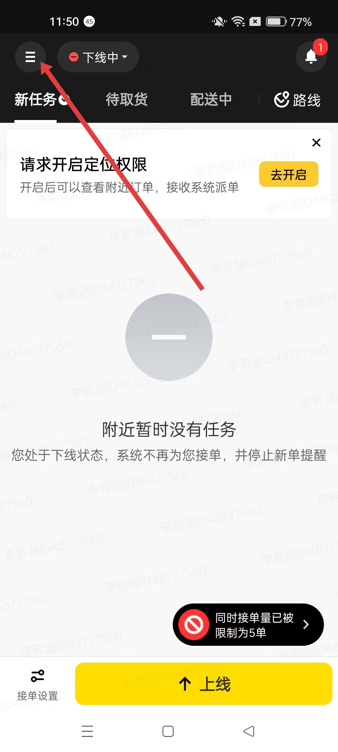 1、進(jìn)入美團(tuán)眾包主界面,點(diǎn)擊左上角三條橫線的菜單按鈕,展開功能列表,準(zhǔn)備進(jìn)行后續(xù)操作。