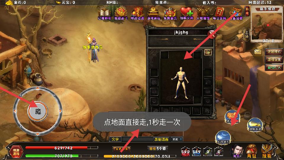 1、點擊跑按鈕加速移動或點地面每秒走一次,打開角色界面查看屬性,釋放幻月彎刀等技能,操控角色在場景開啟冒險,熟悉基礎操作。