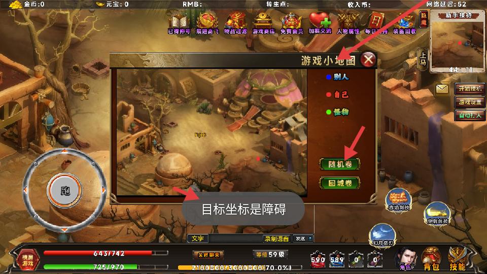 2、打開游戲小地圖分辨敵人、自身、怪物標識,使用隨機卷、回城卷,遇坐標障礙調整路線,借助地圖功能高效探索場景。