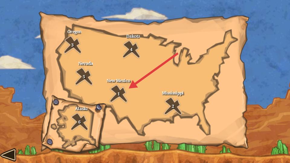 1、地圖界面展示美國(guó)輪廓New Mexico等區(qū)域標(biāo)有數(shù)字標(biāo)記,紅色箭頭指向可探索的1號(hào)區(qū)域,引導(dǎo)玩家開啟西部冒險(xiǎn)。
