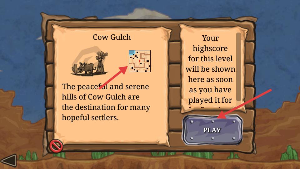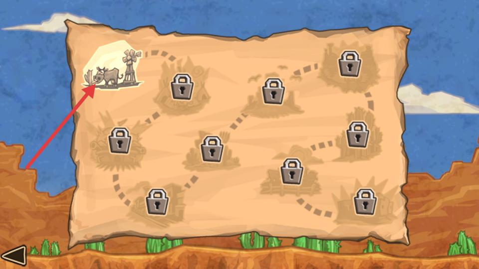 2、關(guān)卡選擇界面泛黃紙張上牛與風(fēng)車圖標(biāo)代表可玩關(guān)卡,其余鎖形標(biāo)記待解鎖,西部元素滿滿,紅色箭頭指向首關(guān),等待玩家踏入游戲。