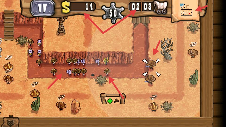 4、西部塔防界面頂部金幣14、波數(shù)02等信息清晰,牛仔角色分布戰(zhàn)場(chǎng),紅色箭頭標(biāo)注敵人路徑與防御點(diǎn),玩家需布局抵御敵人。