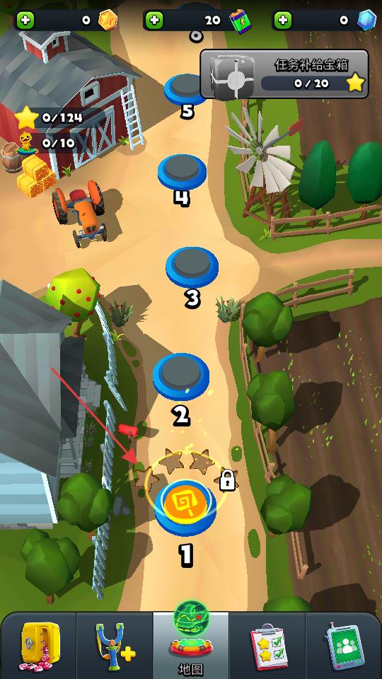 1、游戲關(guān)卡選擇界面,第1關(guān)點(diǎn)擊進(jìn)入,在農(nóng)場(chǎng)場(chǎng)景開啟第1關(guān)的冒險(xiǎn),完成任務(wù)目標(biāo)。
