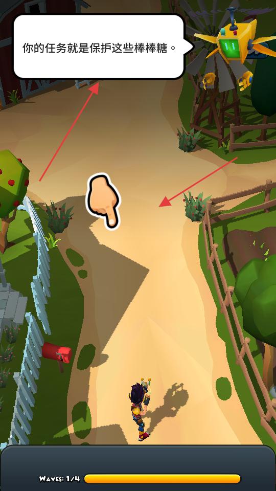2、任務(wù)指引頁,提示保護(hù)棒棒糖,按照指引在農(nóng)場(chǎng)執(zhí)行任務(wù)抵御敵人保護(hù)目標(biāo)。