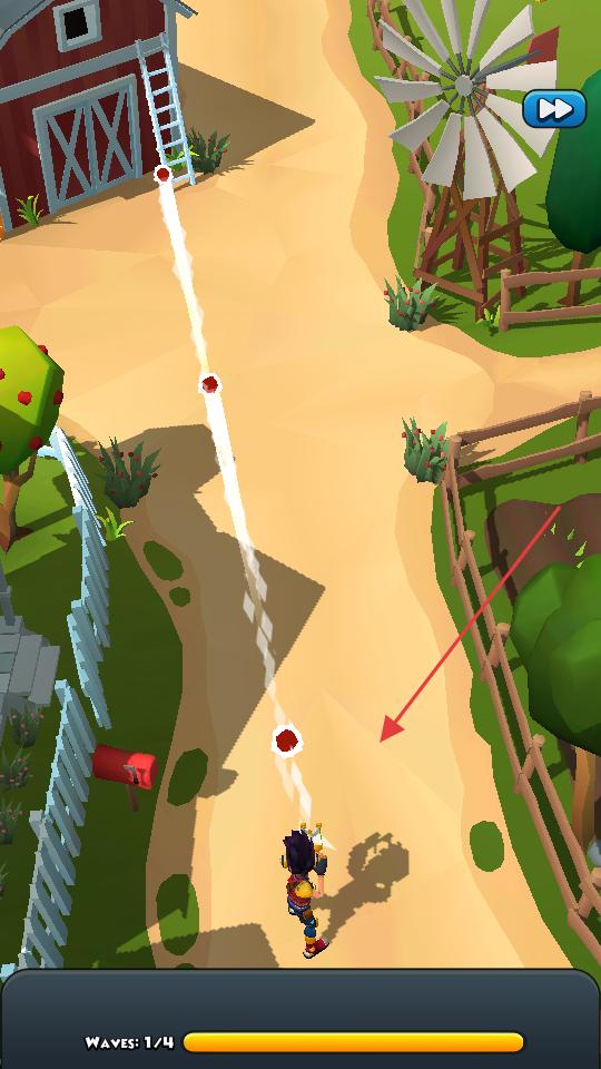 3、打開戰(zhàn)斗場(chǎng)景,紅箭頭指向敵人,角色在農(nóng)場(chǎng)發(fā)射攻擊與敵人戰(zhàn)斗保護(hù)棒棒糖完成當(dāng)前戰(zhàn)斗階段。
