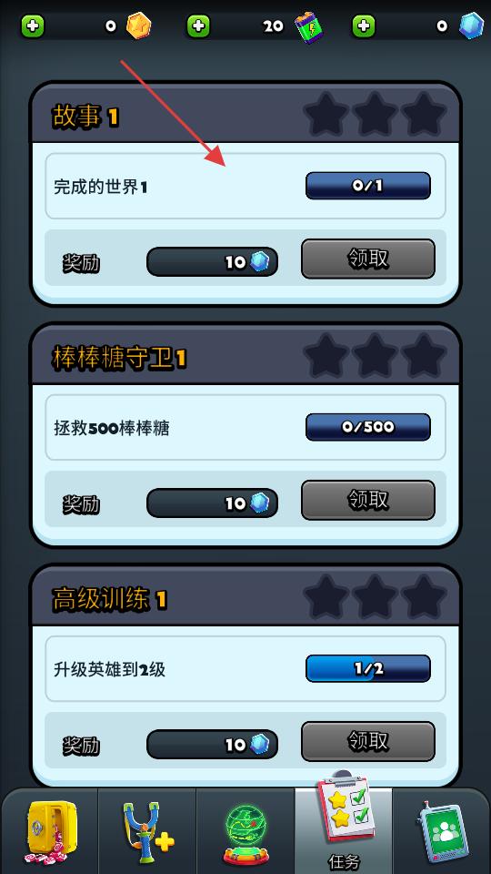 4、任務(wù)頁,紅箭頭標(biāo)故事1任務(wù),目標(biāo)是完成世界1完成后領(lǐng)取鉆石助力角色發(fā)展解鎖新內(nèi)容。