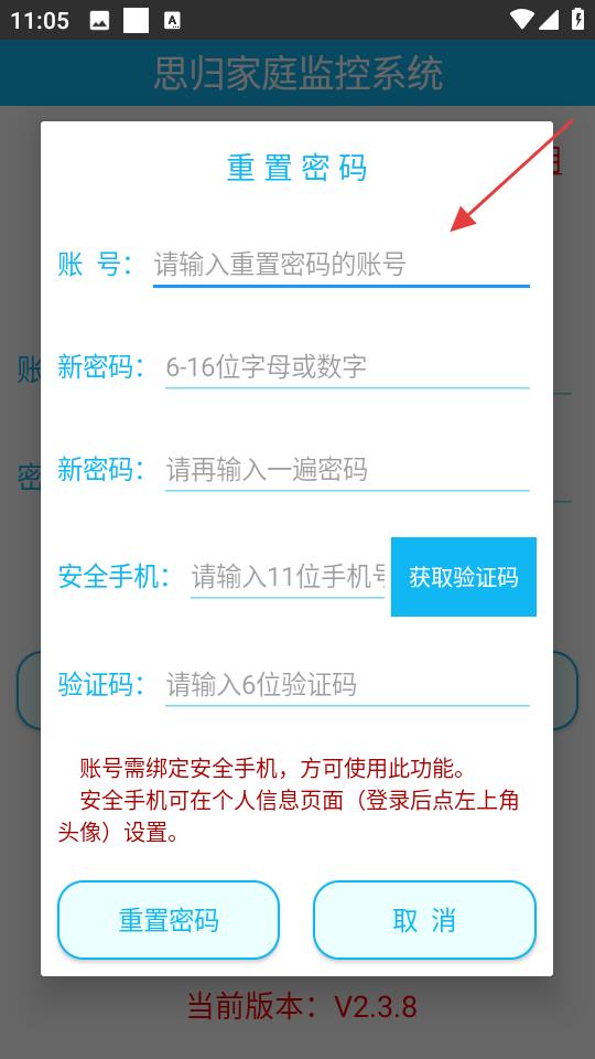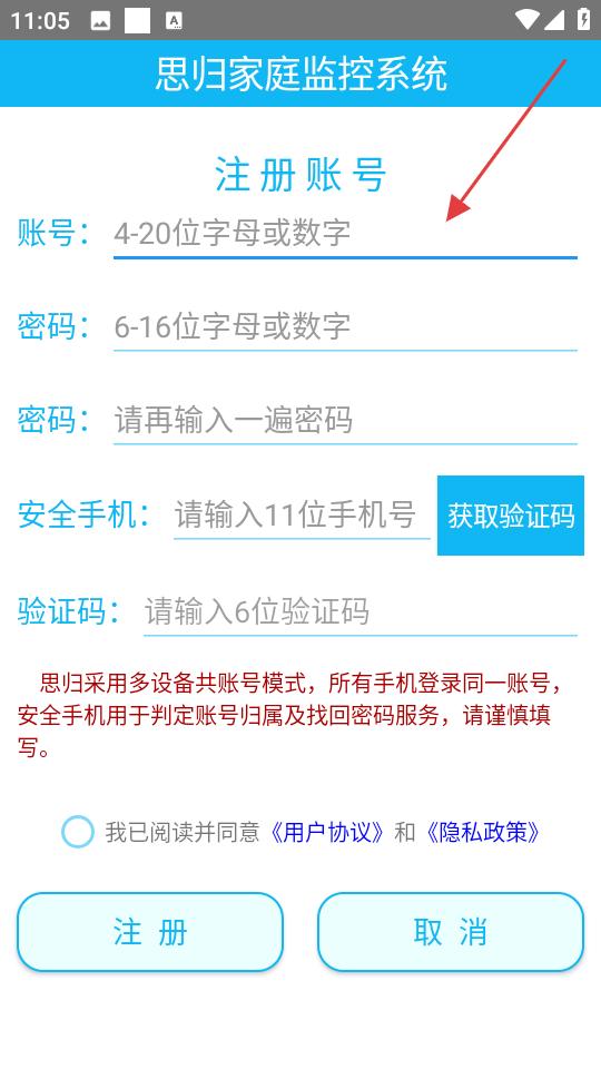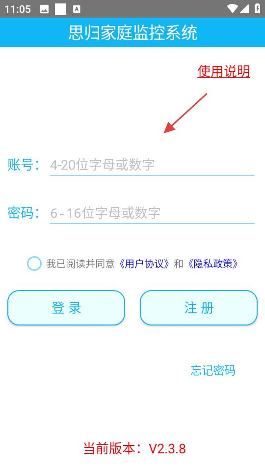 2、思?xì)w家庭監(jiān)控系統(tǒng)登錄頁(yè)面,需輸入4至20位字母或數(shù)字的賬號(hào),以及6至16位字母或數(shù)字的密碼。