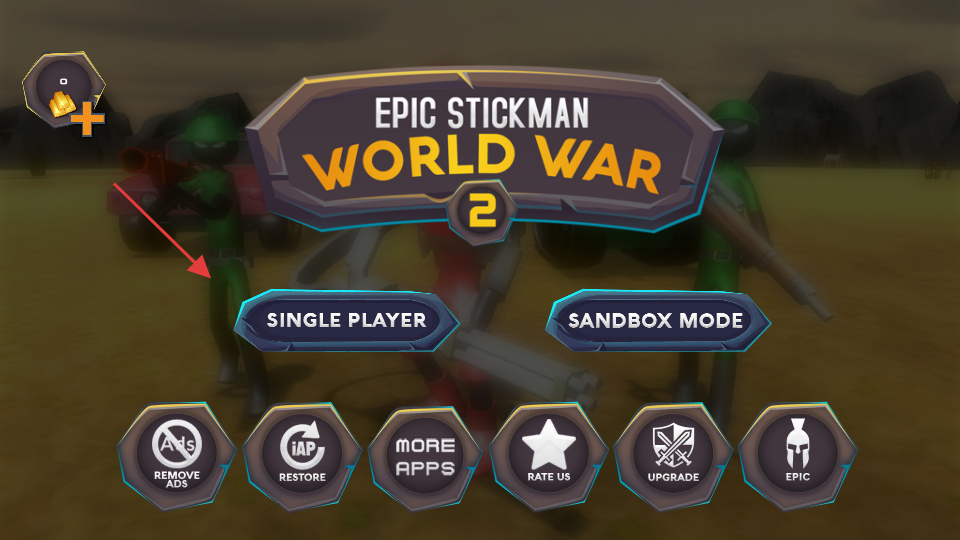 1、進(jìn)入Epic Stickman World War 2,啟動界面展示游戲模式選項(xiàng),可選擇單人或沙盒模式,開始火柴人戰(zhàn)爭的冒險。