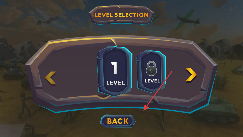 2、游戲的關(guān)卡選擇界面,有可進(jìn)入和鎖定的關(guān)卡,紅箭頭引導(dǎo)Back按鈕,點(diǎn)擊返回調(diào)整游戲選擇。
