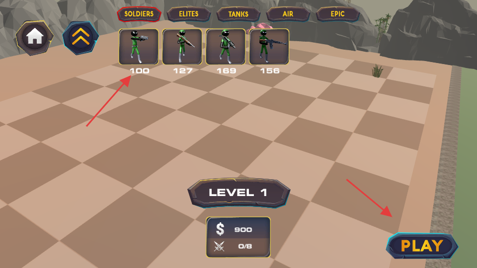 3、進(jìn)入士兵選擇界面中可挑選士兵,確認(rèn)后點(diǎn)擊Play,開啟火柴人戰(zhàn)爭的第一關(guān)戰(zhàn)斗。
