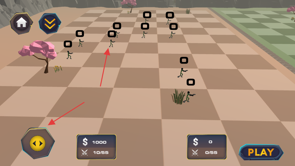 4、進(jìn)入戰(zhàn)斗布置界面,點(diǎn)擊士兵上方的方框,布置士兵點(diǎn)擊Play,開始火柴人戰(zhàn)爭的戰(zhàn)斗。