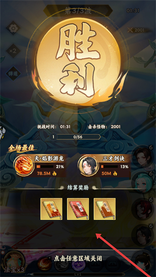 4、戰(zhàn)斗勝利后可獲得結(jié)算獎勵,如功法等物品,點擊任意區(qū)域關(guān)閉界面,繼續(xù)游戲進程。