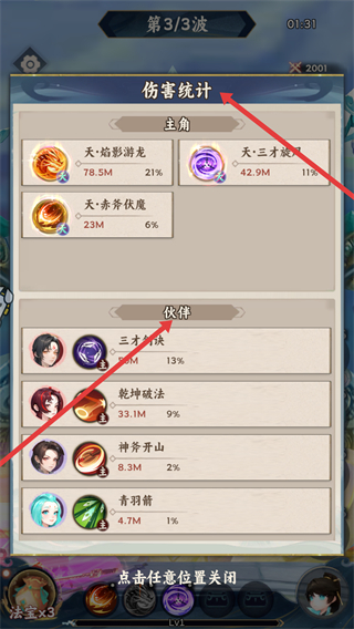 3、戰(zhàn)斗結(jié)束后可查看傷害統(tǒng)計,了解主角和伙伴的傷害占比,總結(jié)戰(zhàn)斗表現(xiàn),提升戰(zhàn)斗策略。