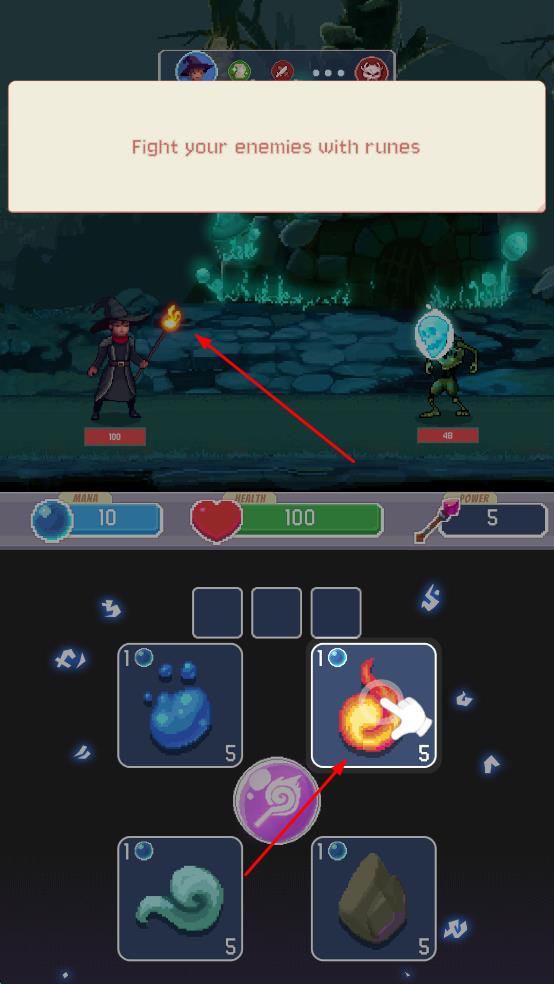 3、湊齊上排符文槽,搭配水、火、石等符文,點擊施法按鈕打連招,提升傷害效率,快速擊潰當(dāng)前敵人推進(jìn)戰(zhàn)斗。